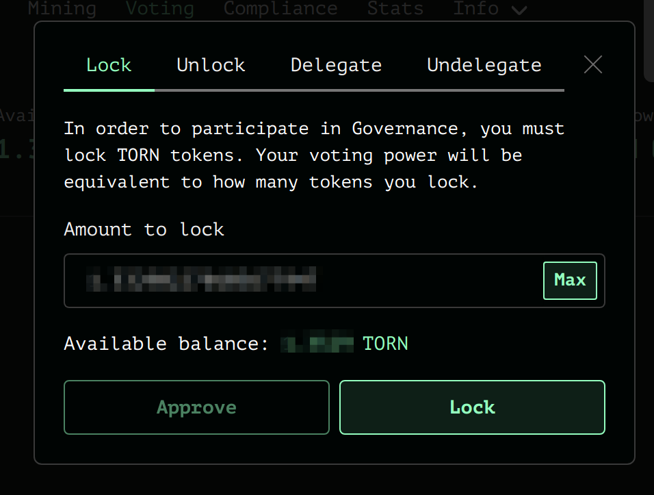 Go to: <https://tornadoeth.cash/governance> ​Click `Manage` -> `Lock Tab`Approve the governance contract to transfer your TORN tokens by clicking on the `Approve` button. Once the approve is confirmed, chose the amount you want to deposit and click `Lock`. Confirm the transaction in your wallet and wait for the confirmation.