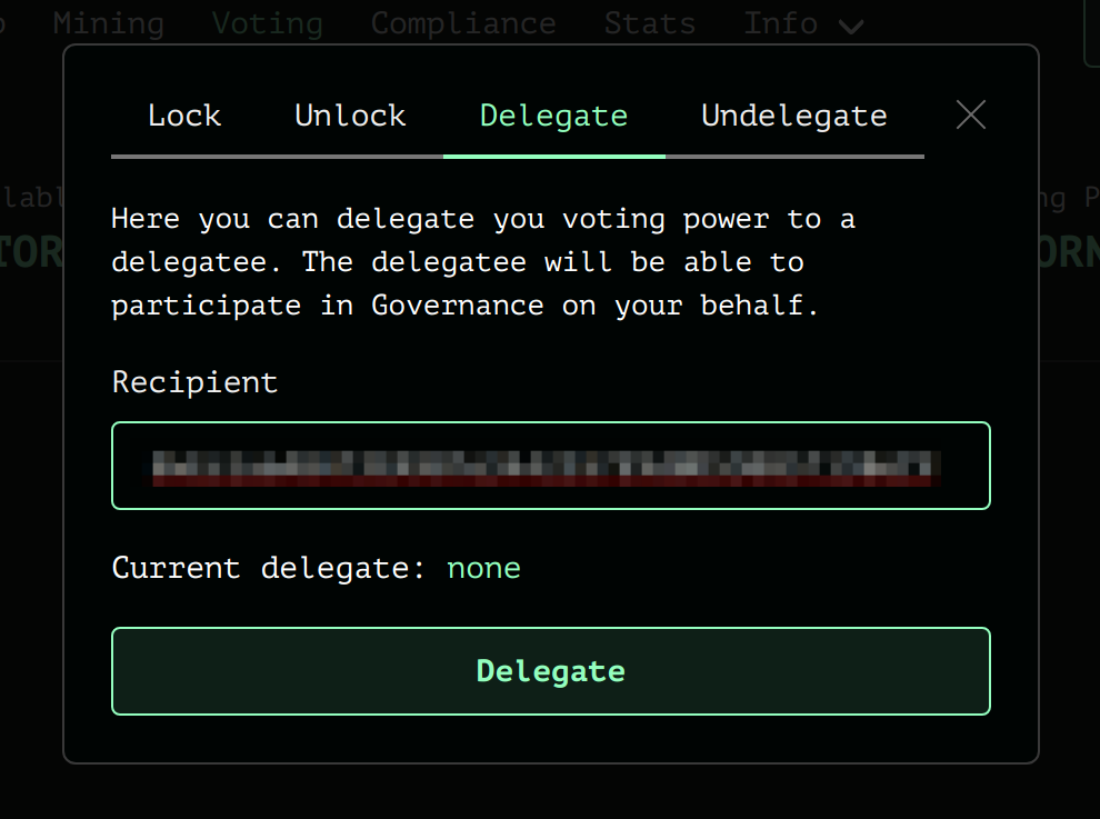 Fill-in the address to which you want to delegate and click **`Delegate`**. Approve the transaction in your wallet and wait for confirmation.<br>