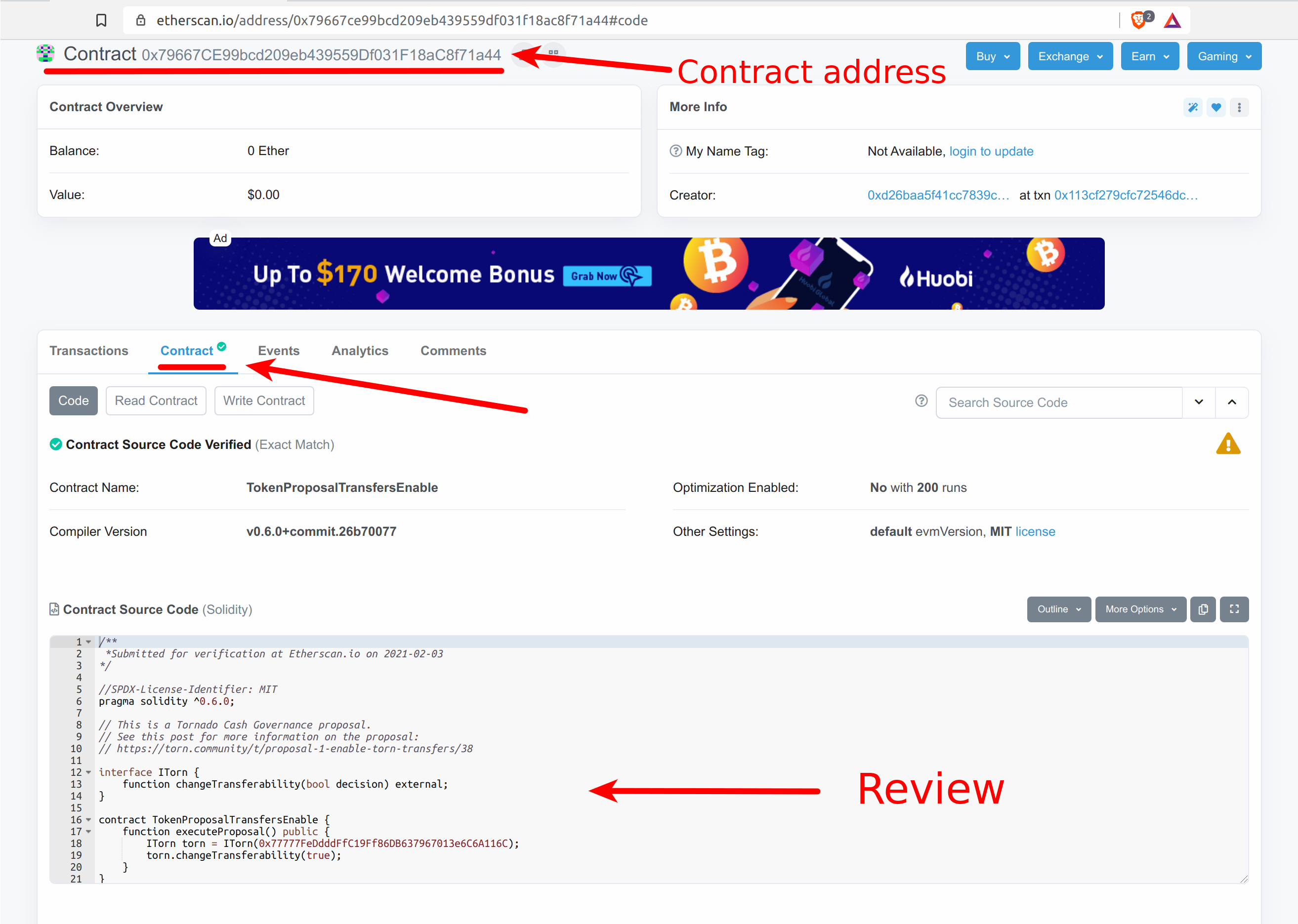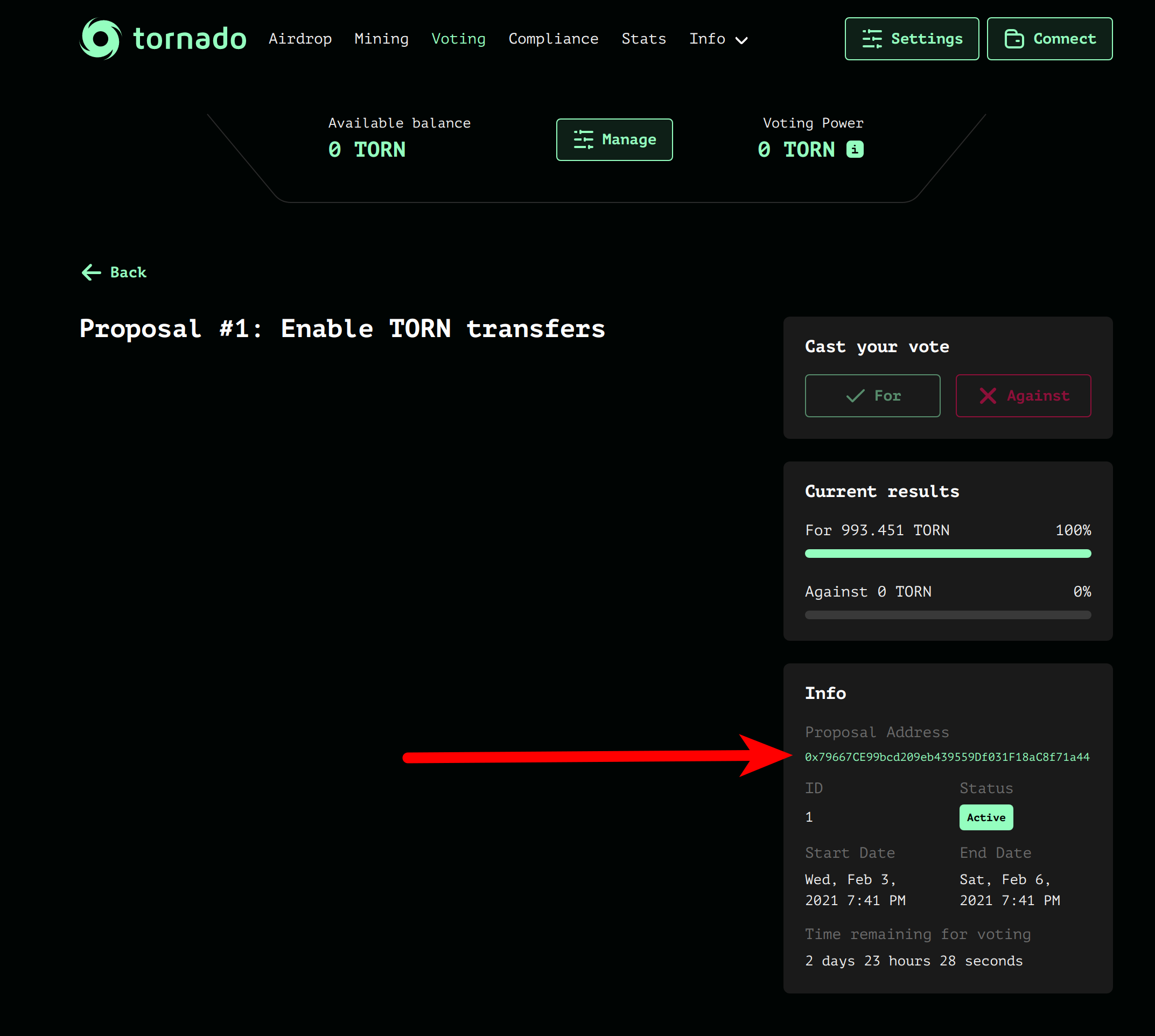 The forum post will provide additional context and arguments on the proposal. Read the thread and make your own mind on the issue. Once a proposal was submitted it should appear on: <https://tornadoeth.cash/governance> Proposal are implemented in the form of a smart contract making changes to the system. It is therefore important to verify the address of the smart-contract and review its code. Find the address of the proposal contract here: